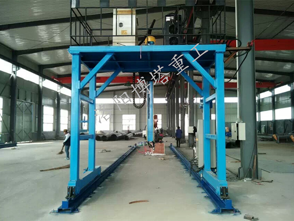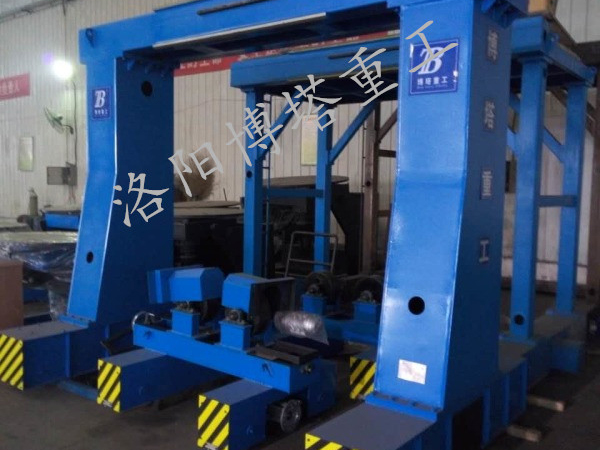 龍門架是本機的骨架部分,各部分均安裝于龍門架上,龍門架主要起支持各部分并帶動各部分以焊接速度行走的作用,其下部為兩個行走梁,由兩臺交流低速電機帶動龍門架在鋼軌上行走,另有兩對靠輪緊靠鋼軌兩側面,保證行走平穩,操作平臺設于龍門架中間位置,龍門架上平臺安裝了掛絲架及焊劑回收機等裝置。